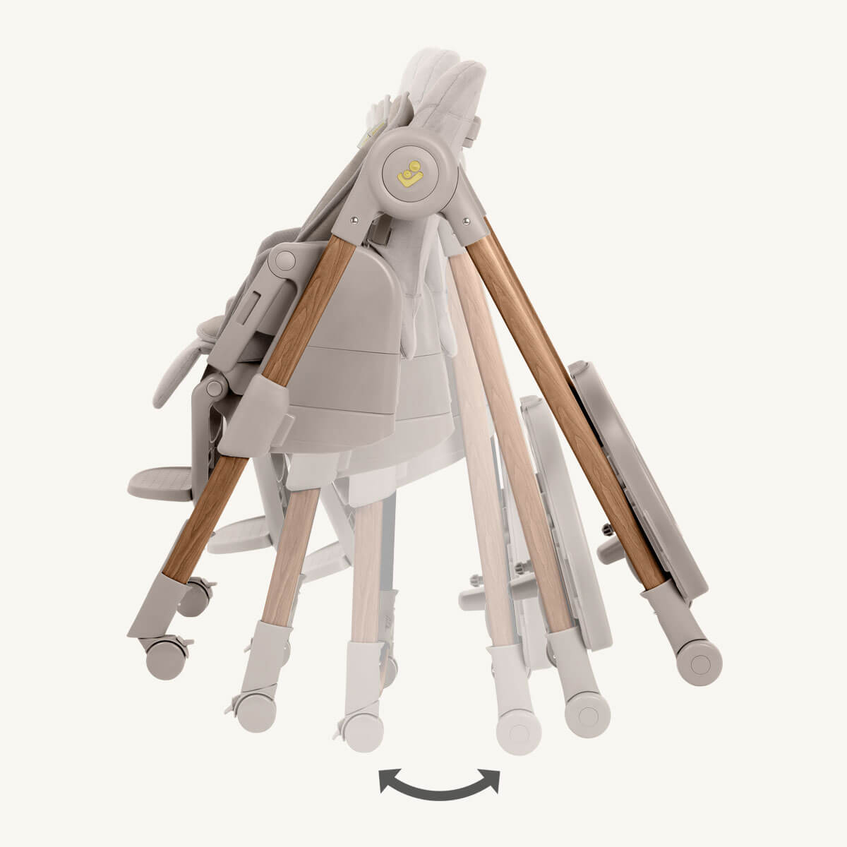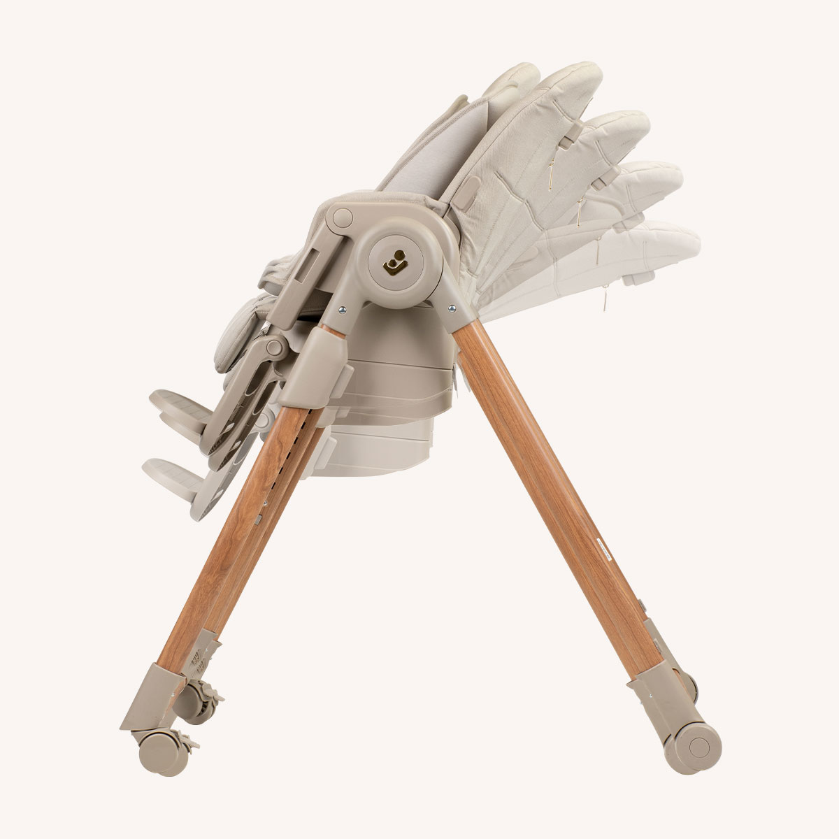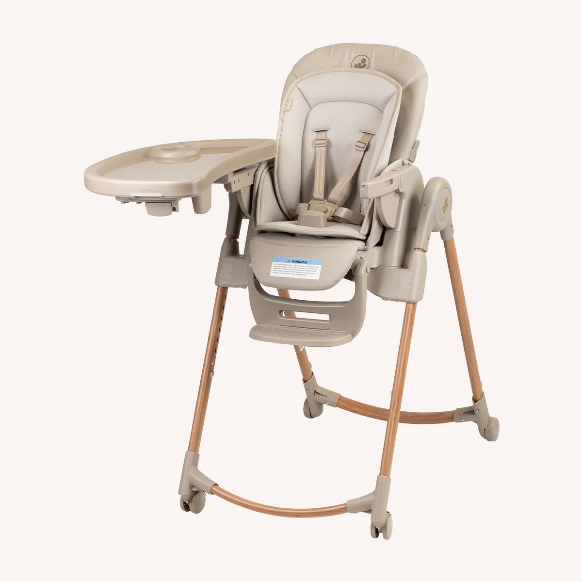 Integrating wood tones with soft fabrics, the highchair's design is inspired by nature, subtly complementing modern interiors.
